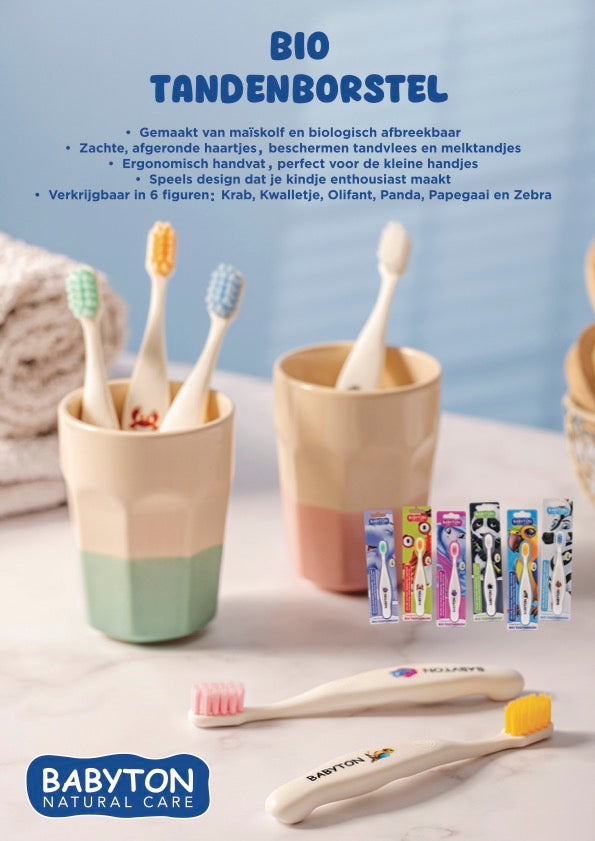 Met deze vrolijke tandenborstel wordt poetsen leuk! De tandenborstel is gemaakt van maïskolf en is biologisch afbreekbaar. Goed voor je kindje én het milieu. De zachte, afgeronde borstelharen reinigen voorzichtig zonder het gevoelige tandvlees of de melktandjes te beschadigen. Het ergonomisch handvat ligt prettig in de kleine handjes en helpt je kind zelf te leren tandenpoetsen op een veilige en comfortabele manier.